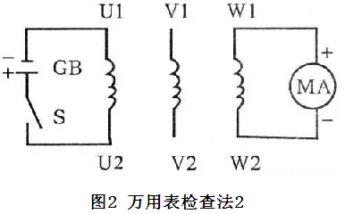 ①萬用表置mA檔,按圖1接線。假設(shè)一端接線為頭(U1、Vl、W1),另一端接線為尾(U2、V2、W2)。